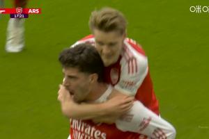 比赛第18分钟,多纳鲁马门前出现超级失误送礼!哈弗茨拦截下皮球顺势破门,阿森纳1-1扳平曼城!